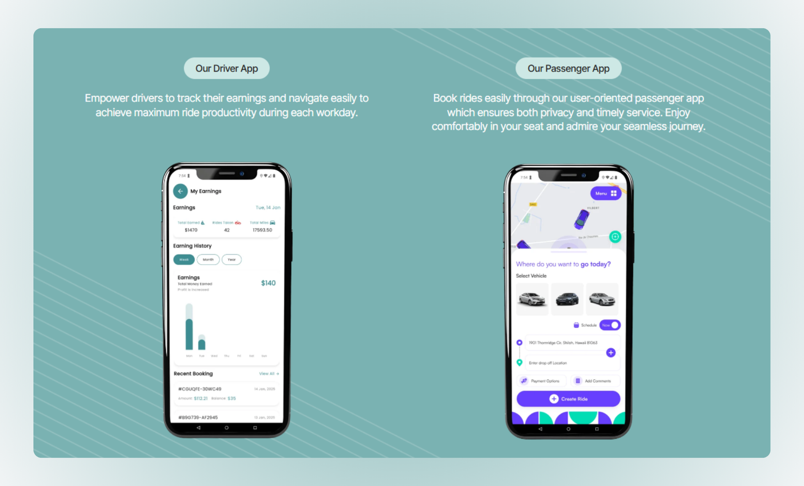The structure emphasizes modular product sections, allowing users to easily navigate between core features like the white-label driver apps, rider interfaces, admin dashboards, and real-time dispatching. We maintained a clean UI to make even complex functionality feel accessible.